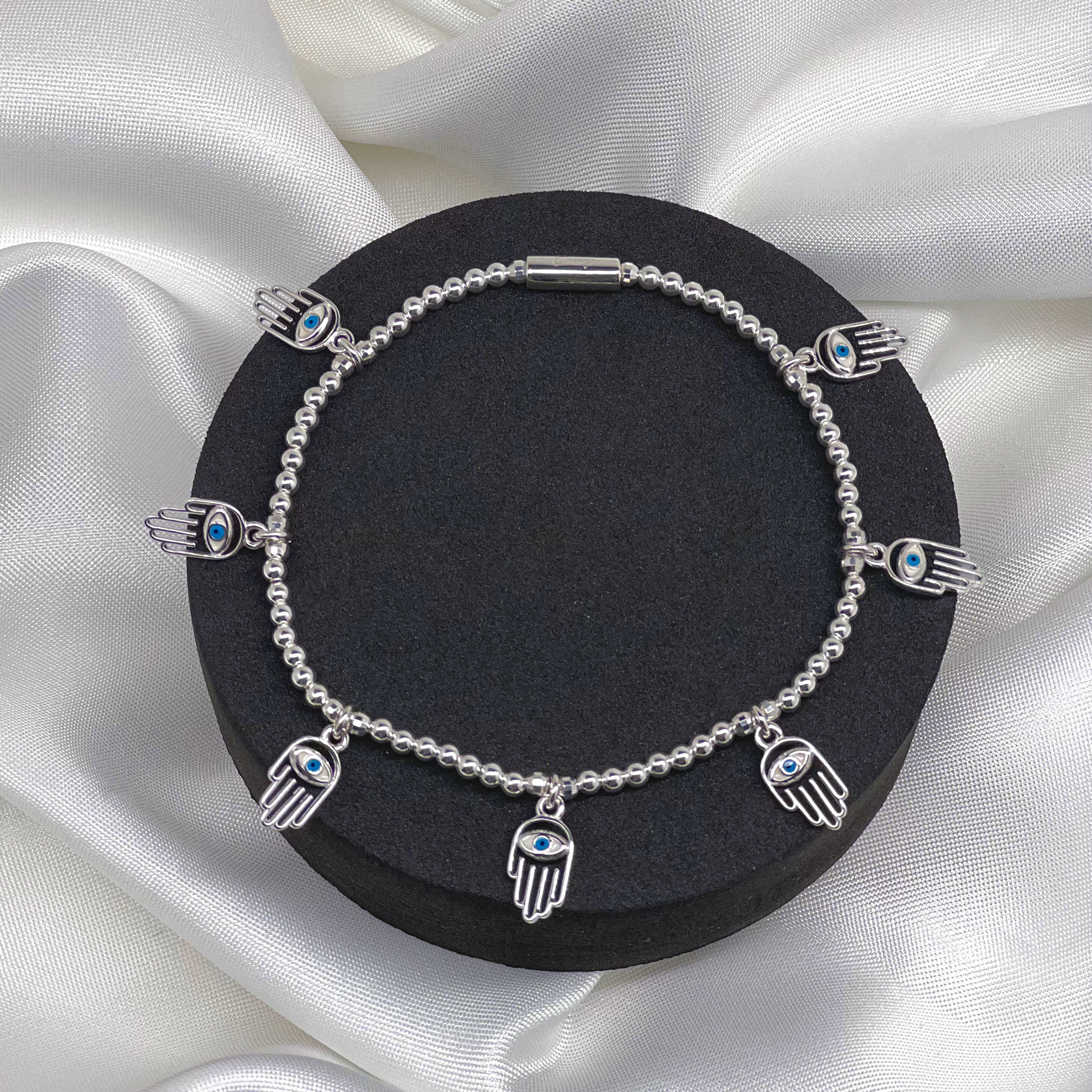 Fabulous and refined, our regnant Vivante Renouveler Hamsa anklet protects the wearer from evil eye, and provides good fortune, health and happiness.